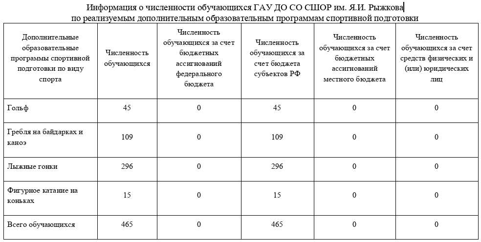 Учреждение реализует следующие дополнительные образовательные программы спортивной подготовки: -Дополнительная образовательная программа спортивной подготовки по виду спорта «Лыжные гонки»; -Дополнительная образовательная программа спортивной подготовки по виду спорта «Гольф»; -Дополнительная образовательная программа спортивной подготовки по виду спорта «Гребля на байдарках и каноэ» -Дополнительная образовательная программа спортивной подготовки по виду спорта «Фигурное катание на коньках» |